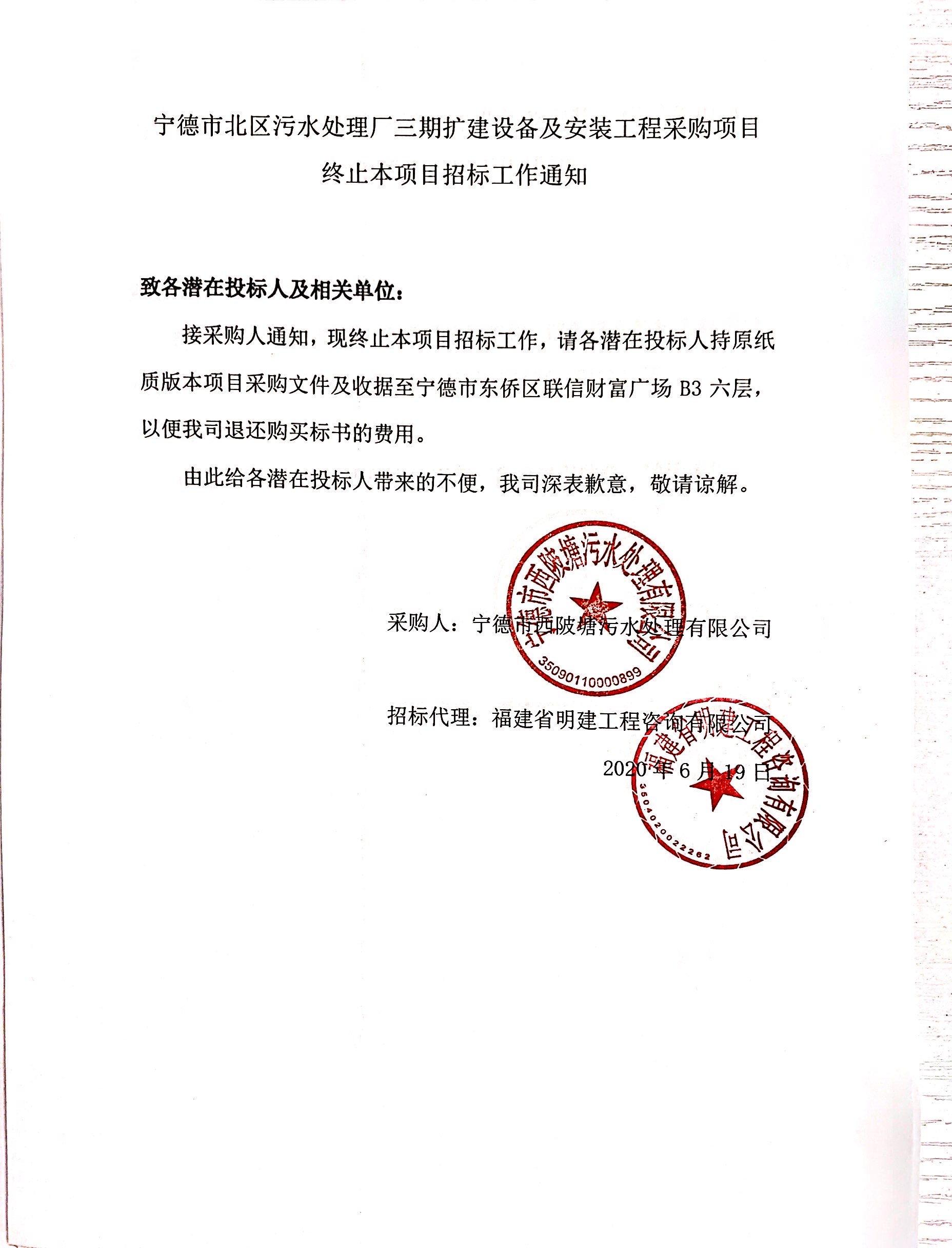 寧德市北區(qū)污水處理廠三期擴建設備及安裝工程采購項目終止本項目招標工作通知