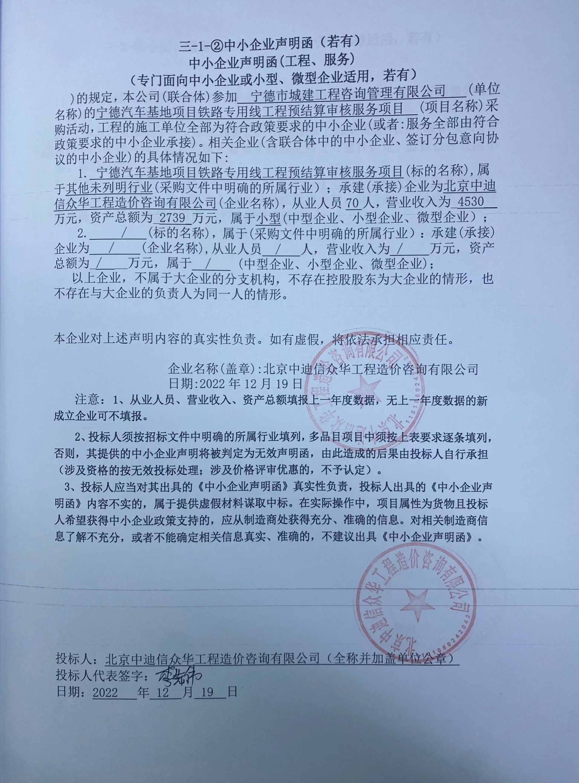 | 1 | 北京中迪信眾華工程造價咨詢有限公司 | 寧德汽車基地項目鐵路專用線工程預(yù)結(jié)算審核服務(wù)項目 | 寧德汽車基地項目鐵路專用線工程預(yù)結(jié)算審核服務(wù)項目 | 滿足招標(biāo)文件要求,具體詳中標(biāo)人的投標(biāo)文件。 | 合同簽訂后20日歷天內(nèi)出具預(yù)算審核報告,接到采購人書面通知后10日歷天內(nèi)出具結(jié)算審核報告,具體詳中標(biāo)人的投標(biāo)文件。 | 按國家、地方、行業(yè)相關(guān)標(biāo)準(zhǔn),具體詳中標(biāo)人的投標(biāo)文件。 |