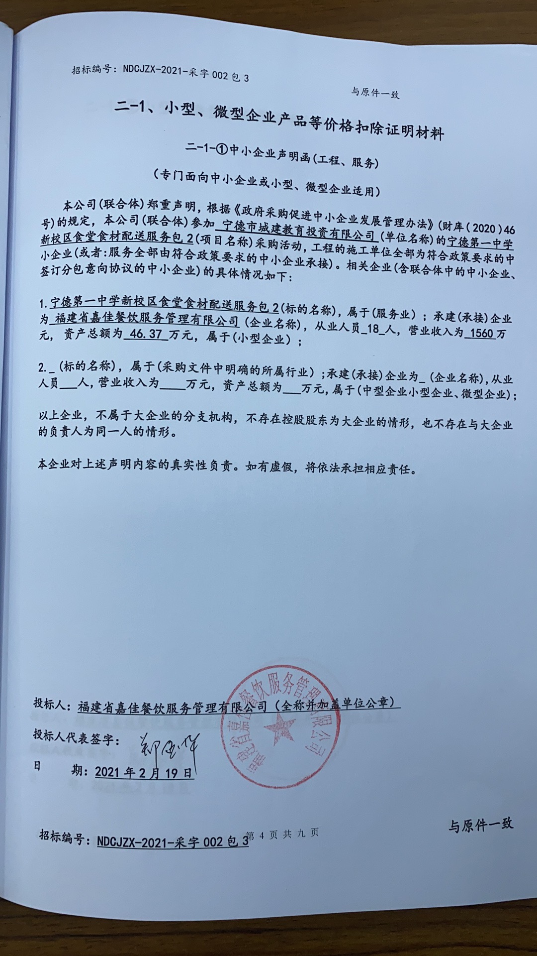 | 3 | 福建省嘉佳餐飲服務(wù)管理有限公司 | 寧德第一中學(xué)新校區(qū)食堂食材配送服務(wù) | 寧德第一中學(xué)新校區(qū)食堂食材配送服務(wù)合同包3鮮豬肉、凍品、水產(chǎn)品 | 疫情期間凍制品需按照采購人要求提供每批次的供貨,都必須進(jìn)行核酸檢測并提供報告,需達(dá)到國家質(zhì)檢單位的標(biāo)準(zhǔn)等,具體詳中標(biāo)人的投標(biāo)文件。 | 供應(yīng)合同期(服務(wù)期限)為兩年(法定工作日),本項目合同一年一簽,采購人有權(quán)對中標(biāo)人的前一年度的服務(wù)進(jìn)行考核并覺得是否續(xù)簽合同,具體起止時間以合同簽定為準(zhǔn)。 | 所提供產(chǎn)品必須符合“中華人民共和國食品安全法”要求等,具體詳中標(biāo)人的投標(biāo)文件。 |
