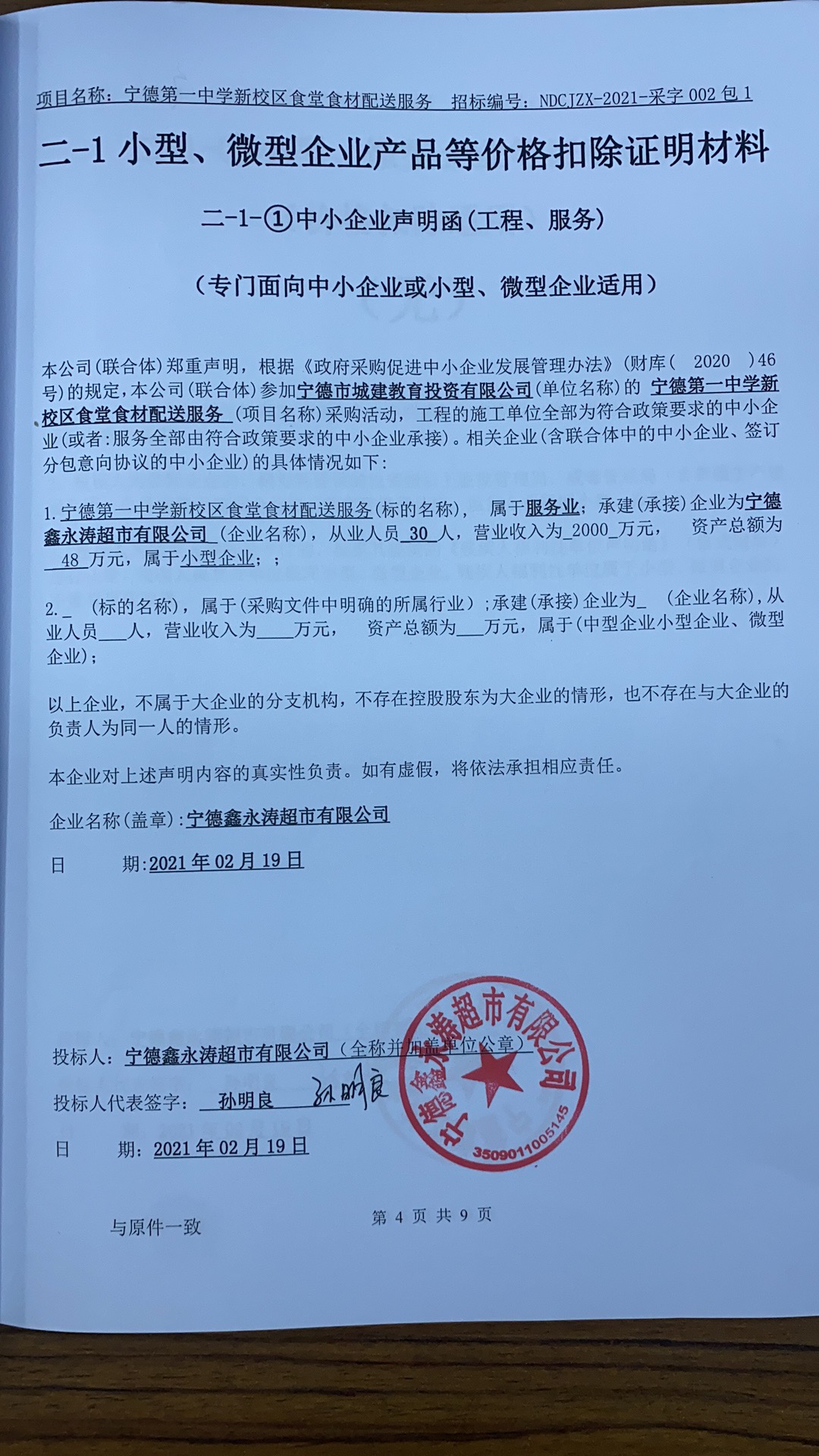 | 1 | 寧德鑫永濤超市有限公司 | 寧德第一中學(xué)新校區(qū)食堂食材配送服務(wù) | 寧德第一中學(xué)新校區(qū)食堂食材配送服務(wù)合同包1主、副食品 | 投標(biāo)人須根據(jù)實際情況安排固定車輛(至少1輛可隨時調(diào)派的車輛)和1名固定司機(jī)、1名送貨人員負(fù)責(zé)送貨上門等,具體詳中標(biāo)人的投標(biāo)文件。 | 供應(yīng)合同期(服務(wù)期限)為兩年(法定工作日),本項目合同一年一簽,采購人有權(quán)對中標(biāo)人的前一年度的服務(wù)進(jìn)行考核并覺得是否續(xù)簽合同,具體起止時間以合同簽定為準(zhǔn)。 | 中標(biāo)人所提供產(chǎn)品必須符合“中華人民共和國食品安全法”要求等,具體詳中標(biāo)人的投標(biāo)文件。 |